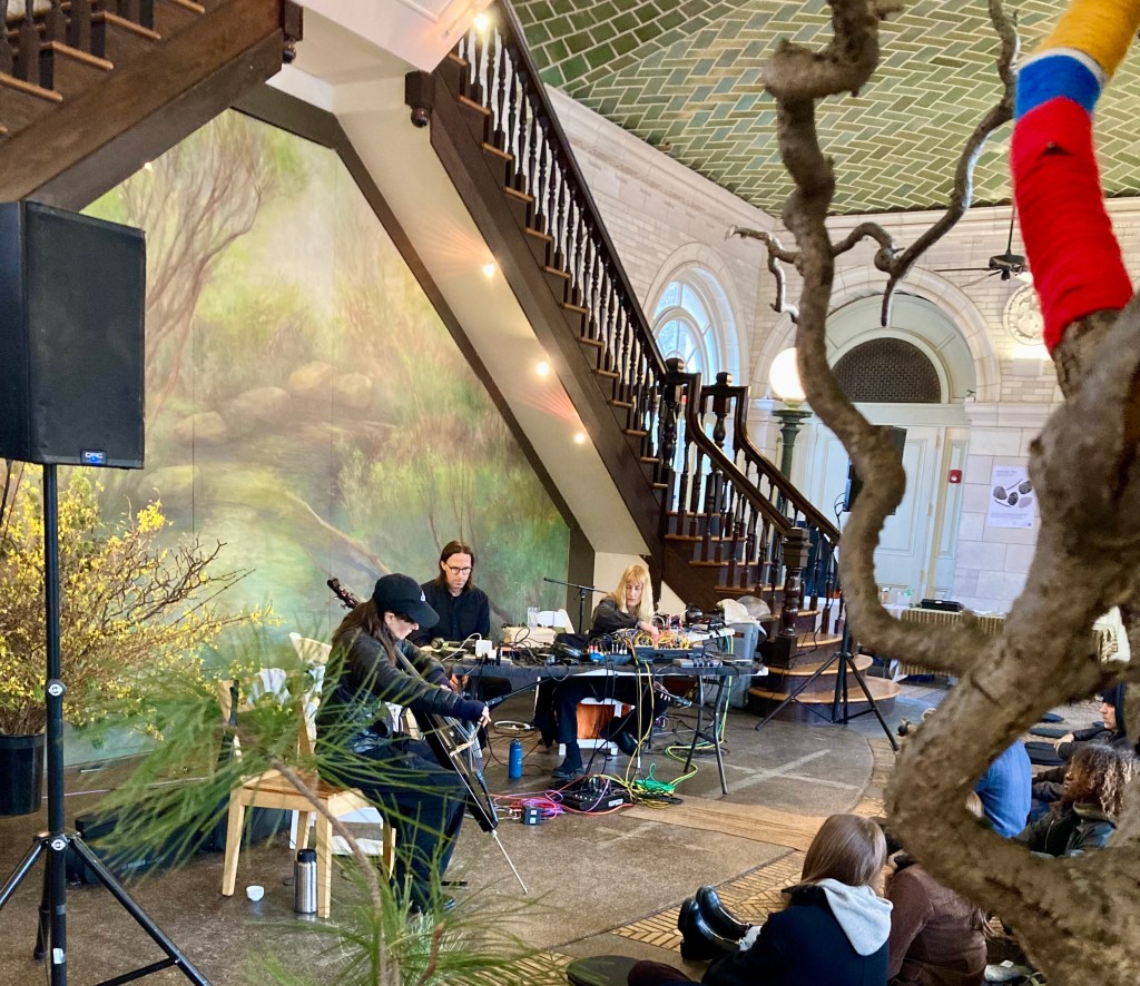 My daily run through Prospect Park always brings joy, but today brought a surprise delight. As I reached the Boathouse a sandwich board declared “Ikebana Exhibit”. Inside, the trio of cellist Kirin McElwain and synth artists Serena Stucke/Dan Tesene performed a meditative piece.
